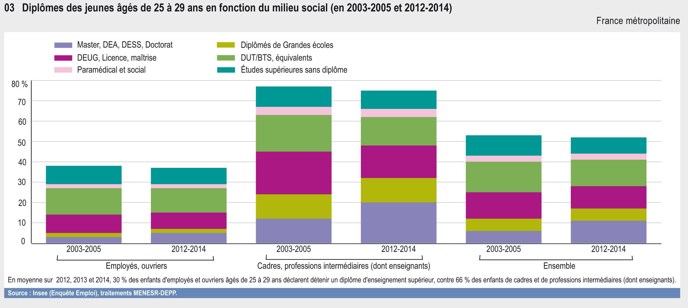 En moyenne sur 2012, 2013 et 2014, 30 % des enfants d'employés et ouvriers âgés de 25 à 29 ans déclarent détenir un diplôme d'enseignement supérieur, contre 66 % des enfants de cadres et de professions intermédiaires (dont enseignants).