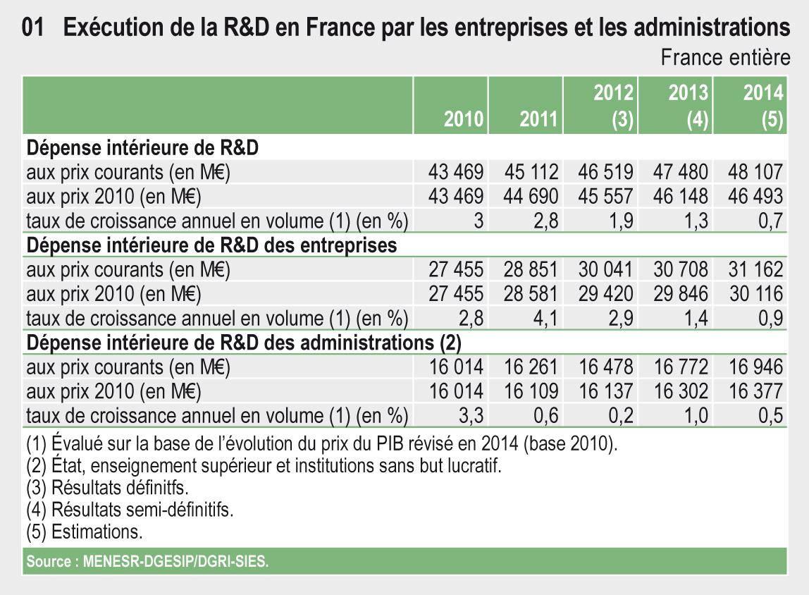 En 2013, la dépense intérieure de recherche et développement (DIRD) s'établit à 47,5 milliards d'euros, soit une hausse de 1,0 milliards d'euros par rapport à 2012. Corrigée de l'évolution des prix, la DIRD a progressé de 1,3 % en 2013. La DIRD des entreprises est en hausse de 1,4 % en volume, tandis que celle des administrations augmente de 1,0 %. L'effort de recherche, qui rapporte la DIRD au produit intérieur brut (PIB), atteint 2,24 % en 2013, après 2,23 % en 2012. Il a augmenté de 0,22 point depuis 2007.