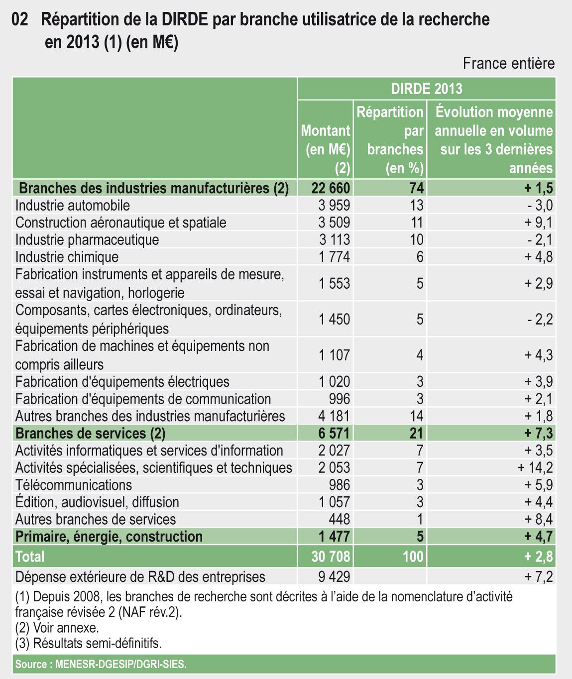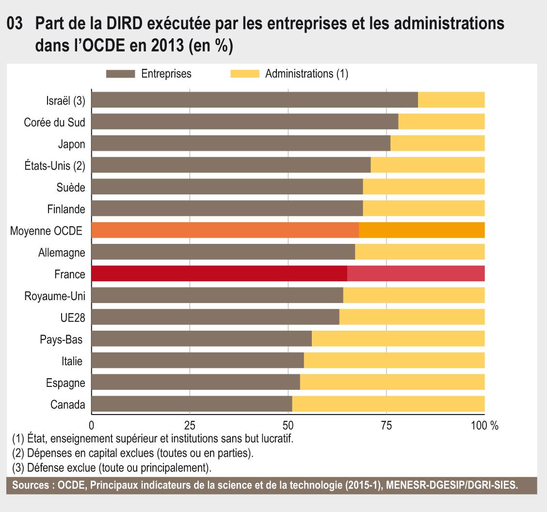 En 2013, six branches bénéficiaires de la recherche (automobile, aéronautique, pharmacie, activités spécialisées, scientifiques et techniques, activités informatiques et services d’information et chimie) exécutent la moitié de la dépense intérieure de R&D des entreprises. Dans le secteur public, les organismes de recherche (EPST, EPIC) exécutent 54 % de la dépense intérieure de R&D des administrations.