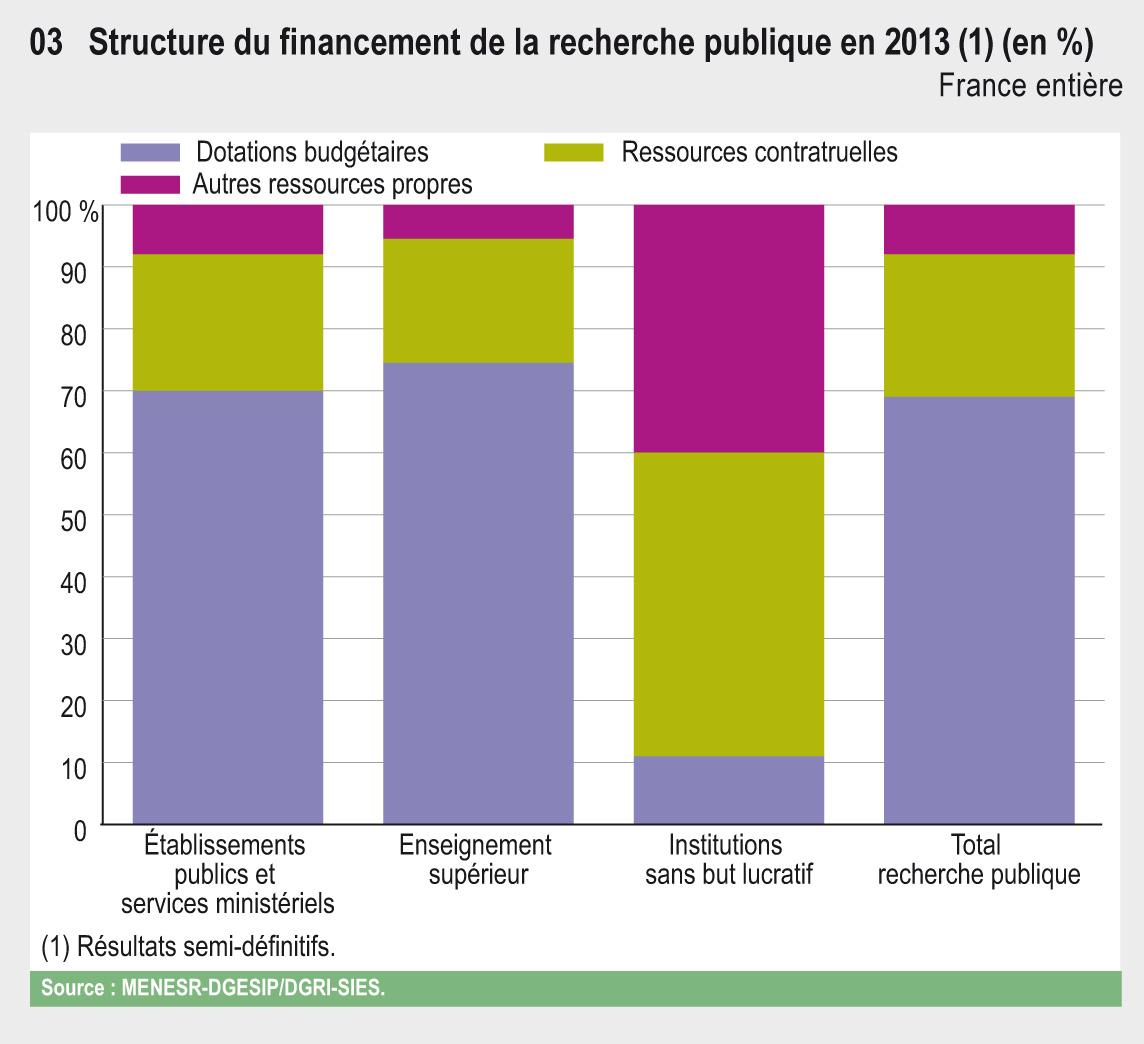 En 2013, les dotations budgétaires consommées par la recherche publique pour la R&D s’élèvent à près de 13 milliards d’euros (Md€) et financent 69 % de l’activité totale de R&D des administrations. Les ressources propres représentent 6 Md€ et comptent pour 31 % des financements du secteur public.