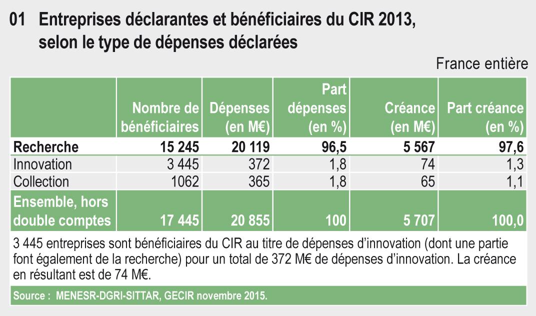 Depuis 2013, le Crédit d’impôt recherche comporte trois composantes en fonction du type de dépenses éligibles : dépenses de recherche, dépenses d’innovation et dépenses de collection pour les secteurs textile-habillement-cuir. La créance 2013 est de 5,57 Md€ au titre des dépenses de recherche, 74 M€ au titre des dépenses d’innovation et 65 M€ au titre des dépenses de collection, soit un total de 5,7 Md€.