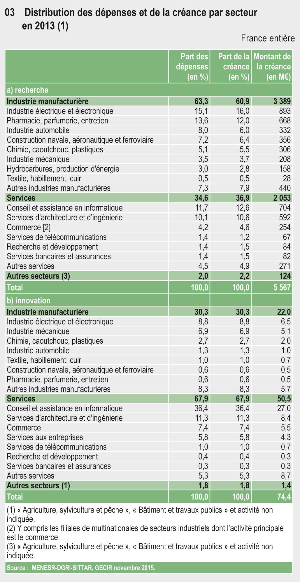 32.03b Distribution des dépenses d’innovation et de la créance par secteur en 2013