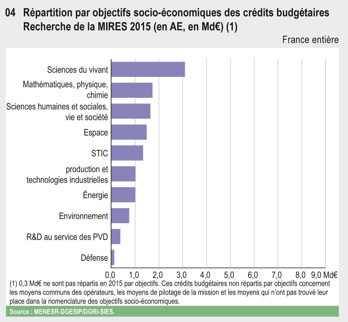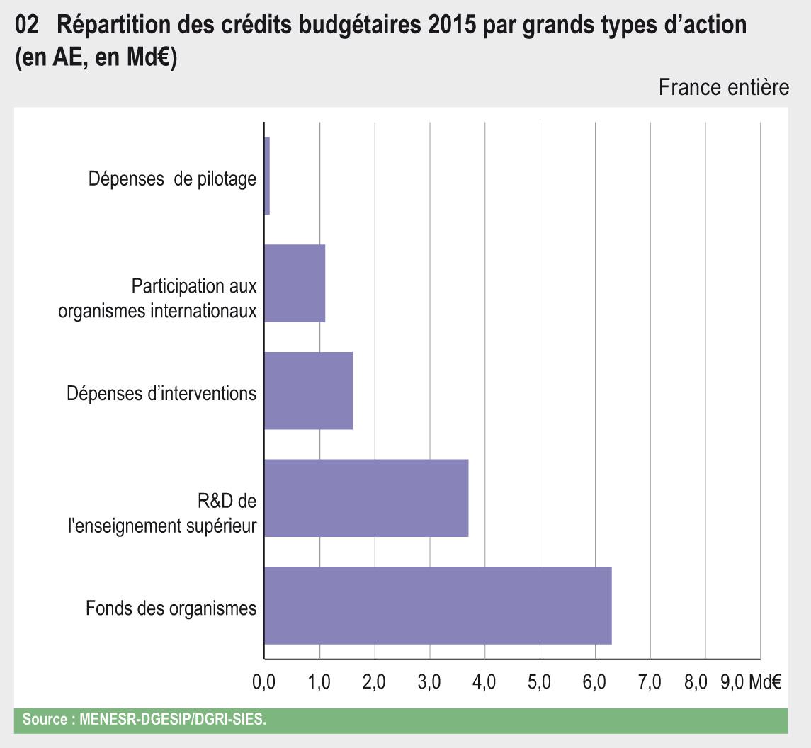 En 2015, la Mission Interministérielle Recherche et Enseignement Supérieur (MIRES) regroupe 13 Md€ de crédits budgétaires pour la recherche. Environ 80 % de ces crédits sont attribués aux organismes de recherche et d’enseignement supérieur au titre de subvention pour charge de service public. Les dépenses d’intervention et de pilotage s’élèvent à 1,7 Md€, soit 13 % des crédits. Enfin, 9 % des crédits de la MIRES sont mobilisés en faveur des programmes et organismes internationaux.