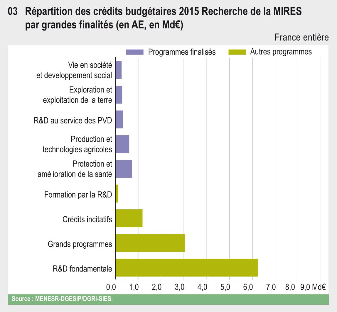 En 2015, le budget recherche et développement technologique s’élève à près de 13 milliards d’euros (Md€), répartis entre les différents organismes de la MIRES. Par rapport à 2014, la majorité des organismes de recherche présentent une baisse plus ou moins sensible de leurs crédits budgétaires ; si les crédits d'intervention du MENESR sont pour l'essentiel équivalents à leur niveau 2014, il n'en est pas de même pour les interventions des autres départements ministériels (industrie et transports). Par ailleurs, pour le programme 150, la rationalisation des actions 6 à 12 « Recherche universitaire » en programmes par Alliances a entraîné une baisse des crédits de 6%. Les établissements de l'Institut Mines Télécom montrent une baisse de leurs ressources MIRES de 14% en moyenne.