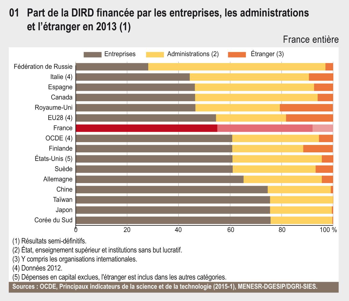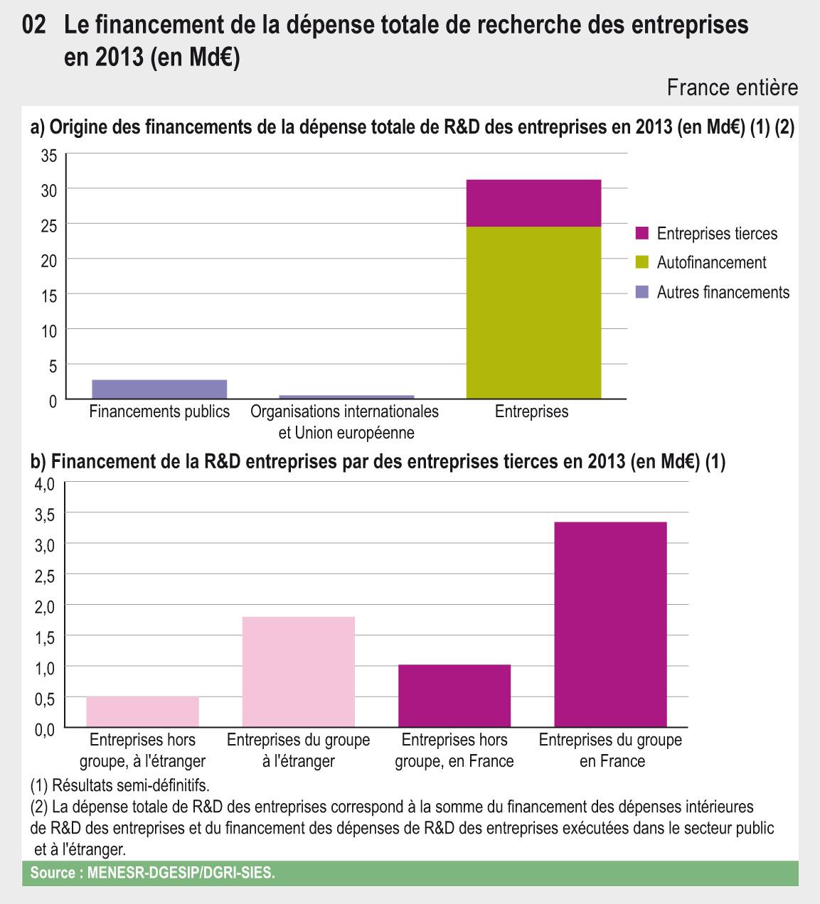 Les entreprises présentes sur le territoire national financent environ 55 % de la dépense intérieure de recherche (DIRD). La dépense totale de R&D des entreprises de 33,7 milliards d'euros (Md€), est financée à 85 % (soit 28,5 Md€) par des entreprises situées en France et pour 8 % (2,7 Md€) par les ressources publiques.