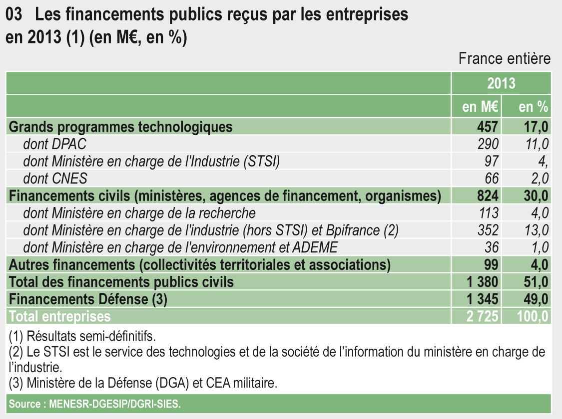 Le financement public de la R&D des entreprises correspond aux contrats de R&D passés avec les organismes publics de recherche et aux dispositifs de soutien public, direct ou indirect. Le soutien direct s’effectue dans le cadre de subventions, d’appels à projets ou de contrats soutenant des programmes porteurs d’enjeux majeurs (tableau 35.03). Les recherches effectuées peuvent correspondre à des commandes des administrations (2,7 Md€), notamment les crédits militaires (1,3 Md €), de la direction des programmes aéronautiques civils (DPAC) ou à des travaux menés par les entreprises et soutenus par des organismes tels Bpifrance, l’agence nationale de la recherche (ANR) ou par le ministère de l’Éducation nationale, de l’Enseignement supérieur et de la Recherche. Le soutien public indirect est mis en œuvre au travers de différents dispositifs fiscaux et d’avances remboursables (en cas de succès commercial) qui ne sont pas comptabilisés ici. Le dispositif le plus important est le CIR (crédit d’impôts recherche) dont les créances se sont élevées à 5,6 Md€ en 2013 et concernait 19 700 entreprises implantées en France (fiche 32).