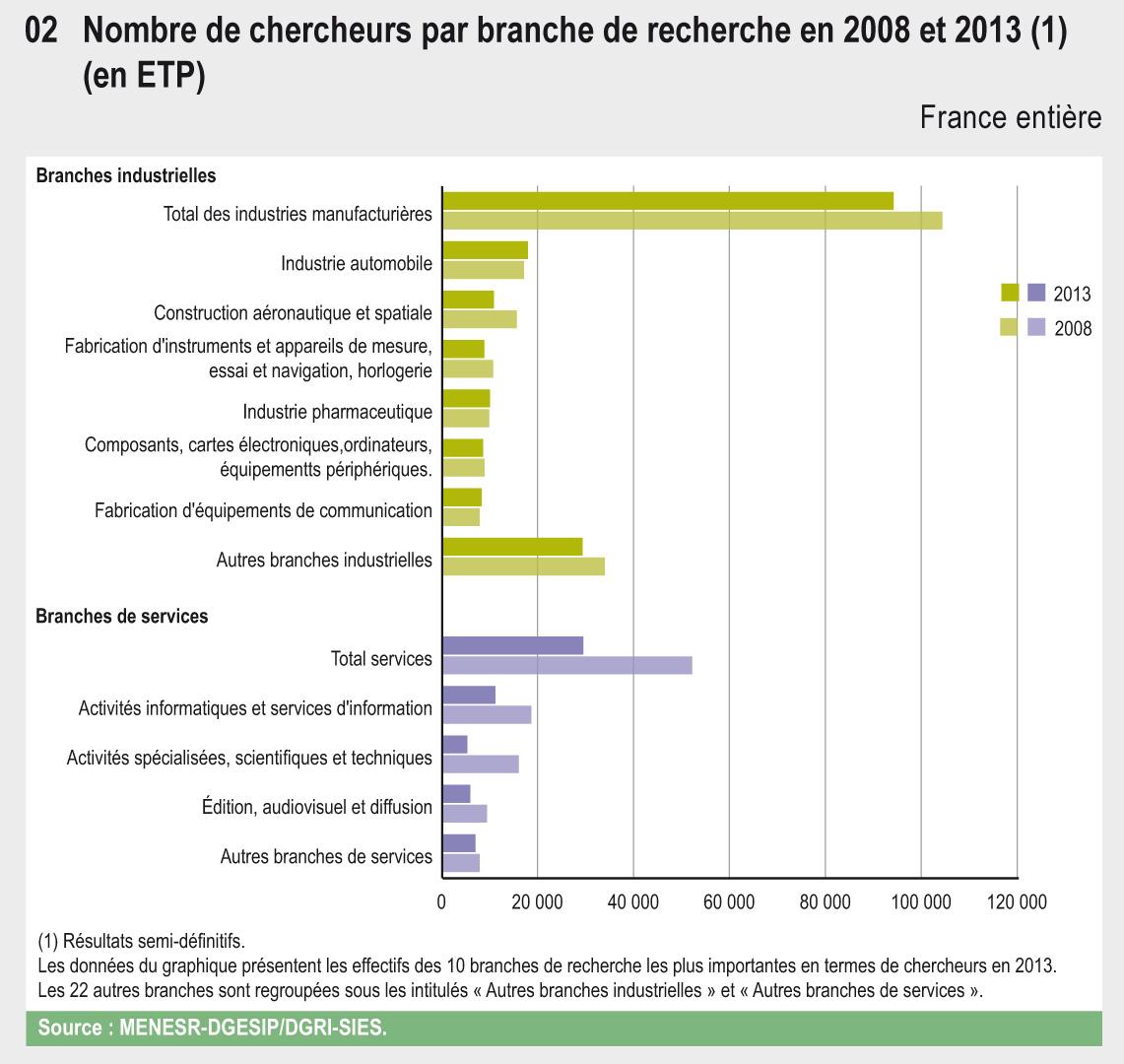 Dans les entreprises, cinq parmi les 32 branches bénéficiaires de la recherche concentrent près de la moitié (48 %) de l’effectif de chercheurs (graphique 36.02) : « activités informatiques et services d’information » (12 %), « industrie automobile » (11 %), pour les « activités spécialisées, scientifiques et techniques » (10 %) et la « construction aéronautique et spatiale » (10 %), « fabrication d’instruments et appareils de mesure, essai et navigation, horlogerie » (7 %) (graphique 02). Entre 2008 et 2013, les effectifs de chercheurs des branches de services ont augmenté 7 fois plus vite (+ 77 %) que ceux des branches des industries manufacturières (+ 11 %) et des branches « primaire, énergie et construction » (+ 15 %).