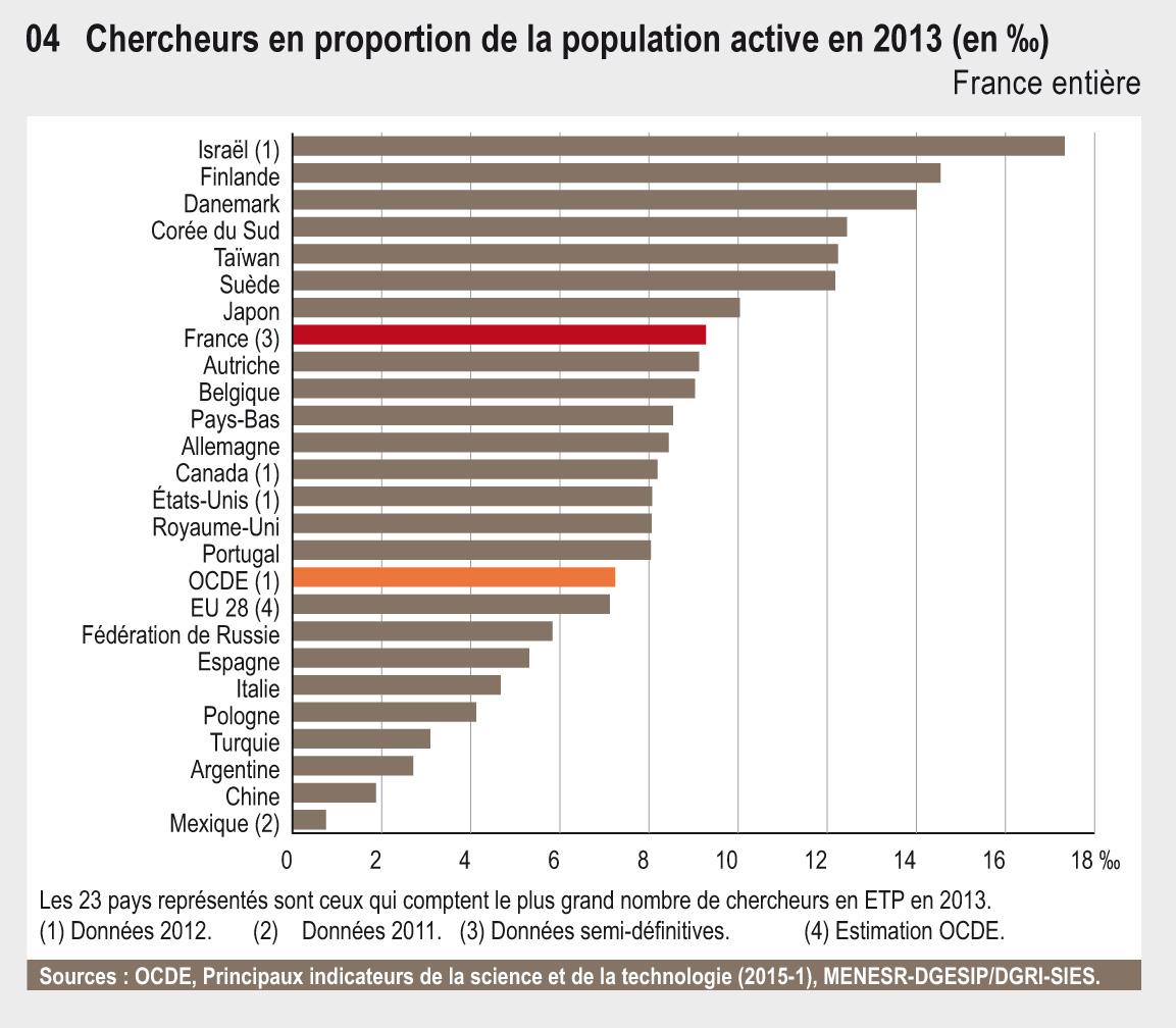 Si l’on rapporte le nombre de chercheurs à la population active, la France, avec 9,3 chercheurs pour mille actifs en 2013, se place derrière la Corée du Sud, le Japon, mais devant l’Allemagne, les États-Unis, et le Royaume-Uni (graphique 36.04). Plusieurs pays moins peuplés se situent aux premiers rangs mondiaux, notamment la Finlande, Taïwan et la Suède.