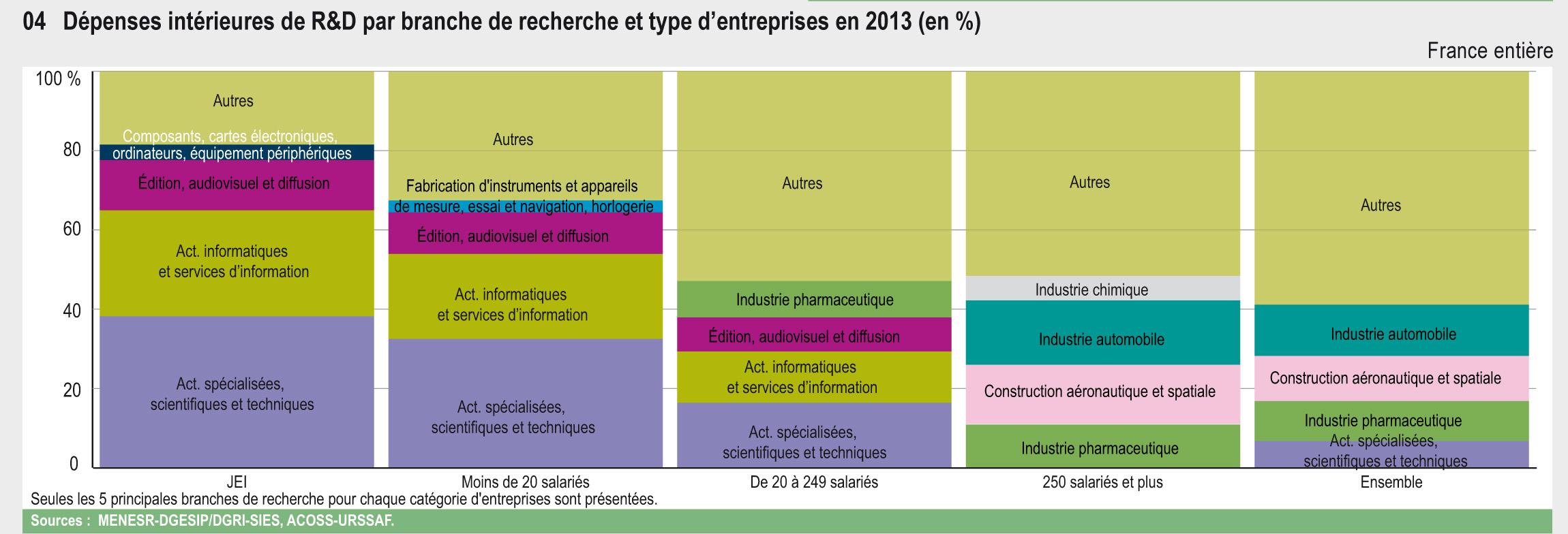 Le statut de jeune entreprise innovante (JEI) a été créé pour favoriser la création et le développement des PME qui conduisent des travaux de R&D. En 2013, leurs dépenses intérieures de R&D s’élèvent à 830 millions d’euros et se concentrent essentiellement dans des branches de services.