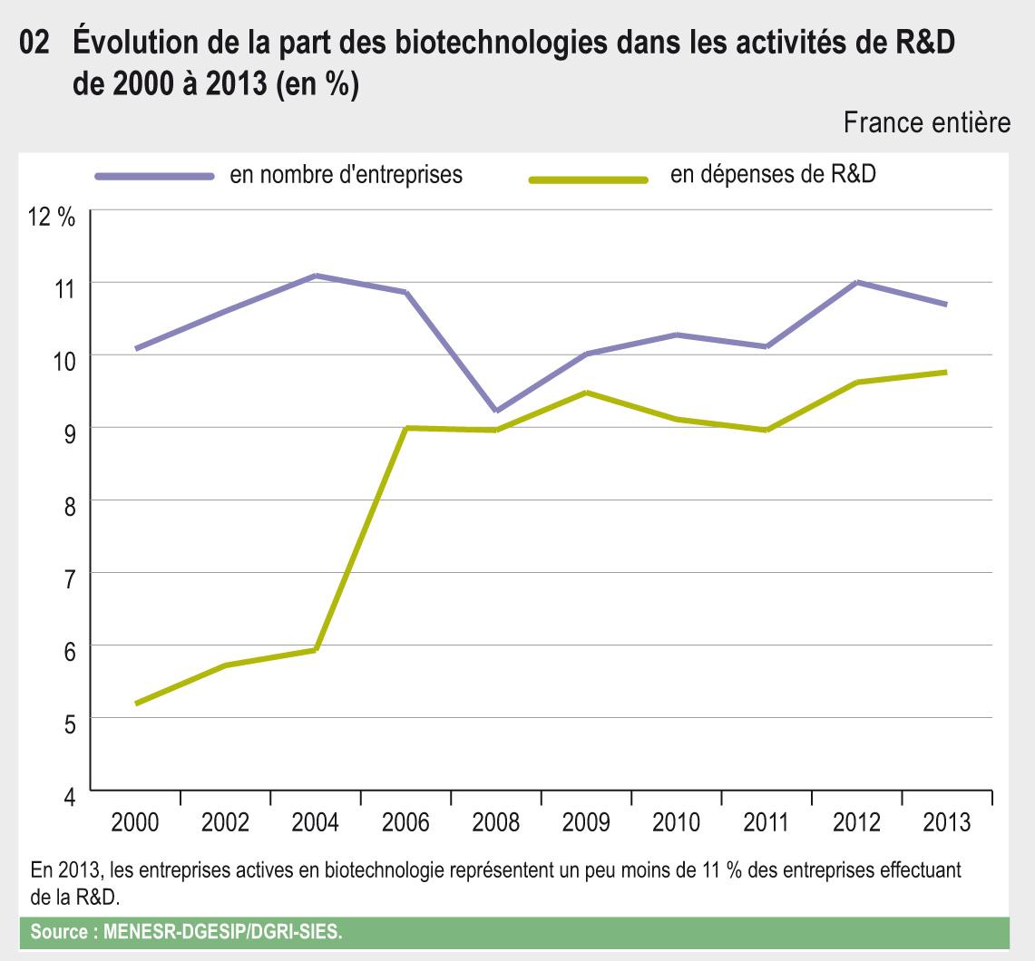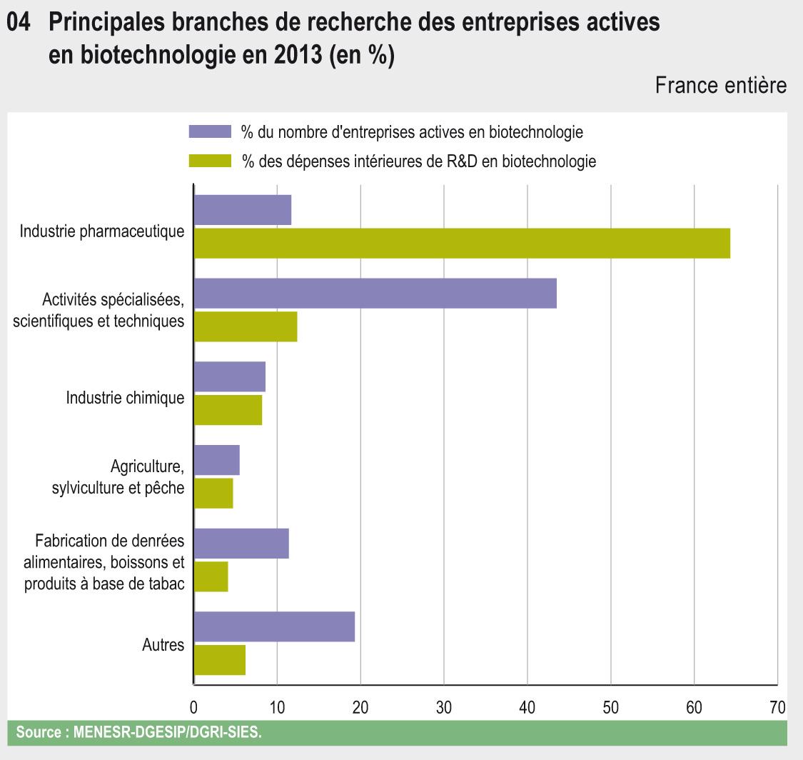 La dépense intérieure de R&D des entreprises (DIRDE) en biotechnologie s’élève à 3,0 milliards d’euros (Md€) en 2013. Elle représente près de 10 % de la DIRDE. La proportion d’entreprises de R&D qui sont actives dans ce domaine est stable par rapport à 2012, à 11 %. Les entreprises spécialisées en biotechnologie sont surtout des petites structures.