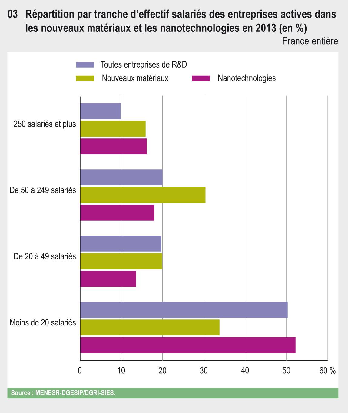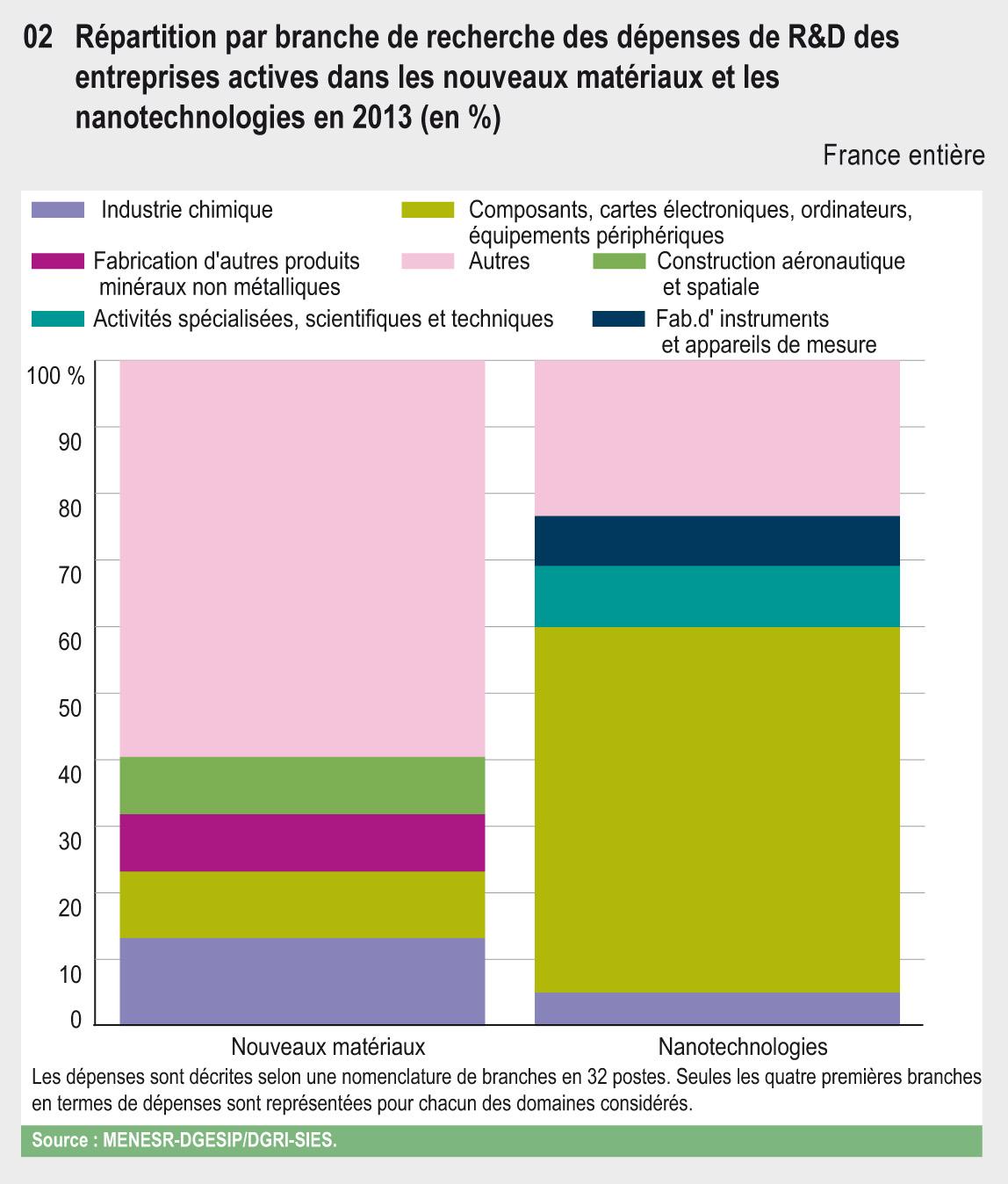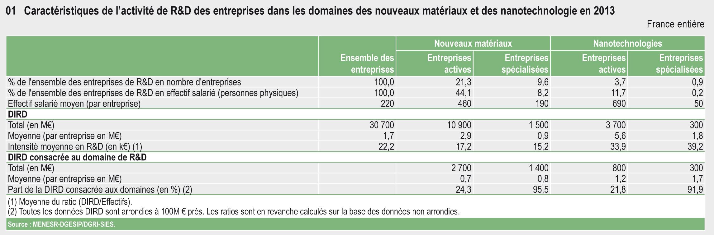 En France, en 2013, près d’un quart des entreprises de R&D engagent des dépenses intérieures de R&D dans les domaines des nouveaux matériaux ou des nanotechnologies. La dépense de recherche globale associée à ces deux domaines s’élève à 3,5 milliards d'euros (Md€) en 2013, soit 11,4 % de l’ensemble de la DIRDE.