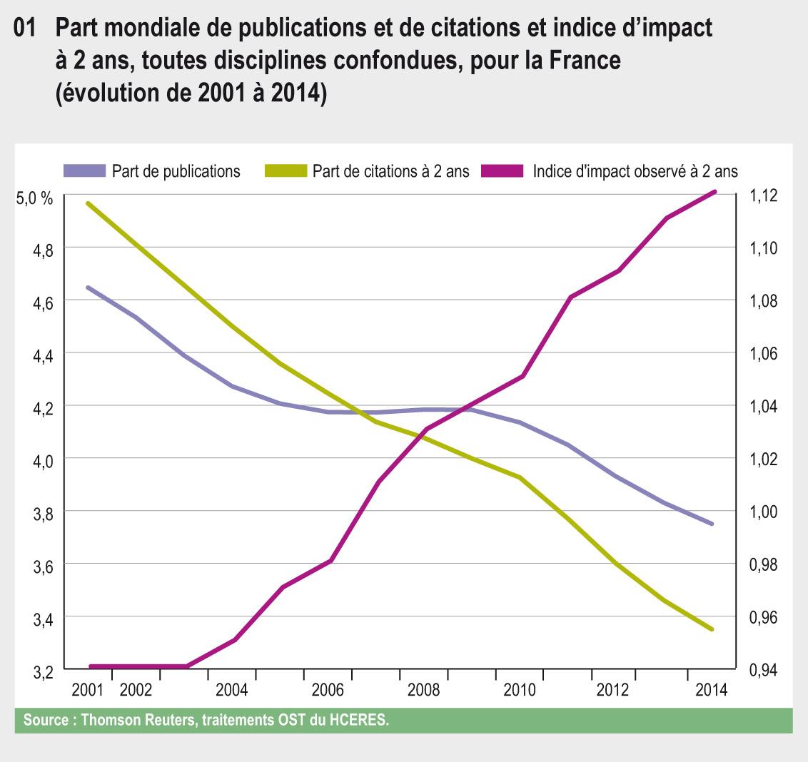 Au début des années 1990, la part mondiale de publications de la France croît pour dépasser 5 % en 1995, puis elle reste stable. À partir de 1999, cette part baisse de façon continue, notamment du fait de l’arrivée de nouveaux pays sur la scène scientifique internationale. La baisse, marquée de 1999 à 2005, ralentit entre 2005 et 2010 puis reprend plus sensiblement au rythme du début des années 2000. La part de citations à 2 ans diminue également sur la période, mais dans de moindres proportions. En conséquence, l’indice d’impact de la France s’est sensiblement amélioré sur l’ensemble de la période, passant de 0,91 en 1993 à 1,12 en 2014.