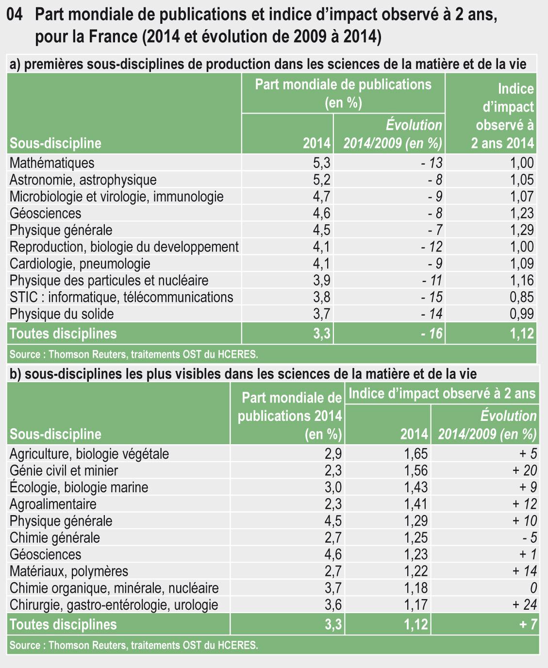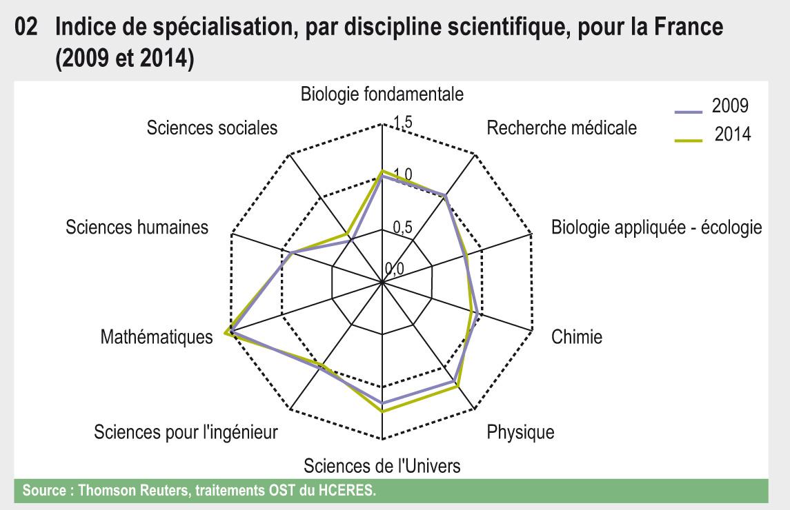 En 2014, toutes disciplines confondues, la France a contribué à 3,3 % des publications scientifiques mondiales. Si la recherche française présente une forte spécialisation dans la grande discipline Mathématiques et dans la discipline « Astronomie, astrophysique », c’est dans les disciplines « Agriculture, biologie végétale », « Génie civil et minier », « Écologie, biologie marine » et « Agroalimentaire » que ses publications sont les plus citées au niveau international.