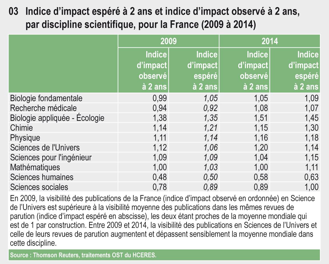 En 2009, la visibilité des publications de la France (indice d'impact observé en ordonnée) en Science de l'Univers est supérieure à la visibilité moyenne des publications dans les mêmes revues de parution (indice d'impact espéré en abscisse), les deux étant proches de la moyenne mondiale qui est de 1 par construction. Entre 2009 et 2014, la visibilité des publications en Sciences de l'Univers et celle de leurs revues de parution augmentent et dépassent sensiblement la moyenne mondiale dans cette discipline.