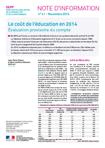 Note d'information DEPP 15.41 - Le coût de l’éducation en 2014 - Jean-Pierre Dalous, Aline Landreau - November 2015 En 2014, la dépense moyenne pour un élève ou un étudiant est de 8 360 euros. Elle s’élève avec le niveau, allant de 6 120 euros pour un écolier à 11 560 euros pour un étudiant. Depuis 2013, la dépense moyenne par élève du second degré augmente.